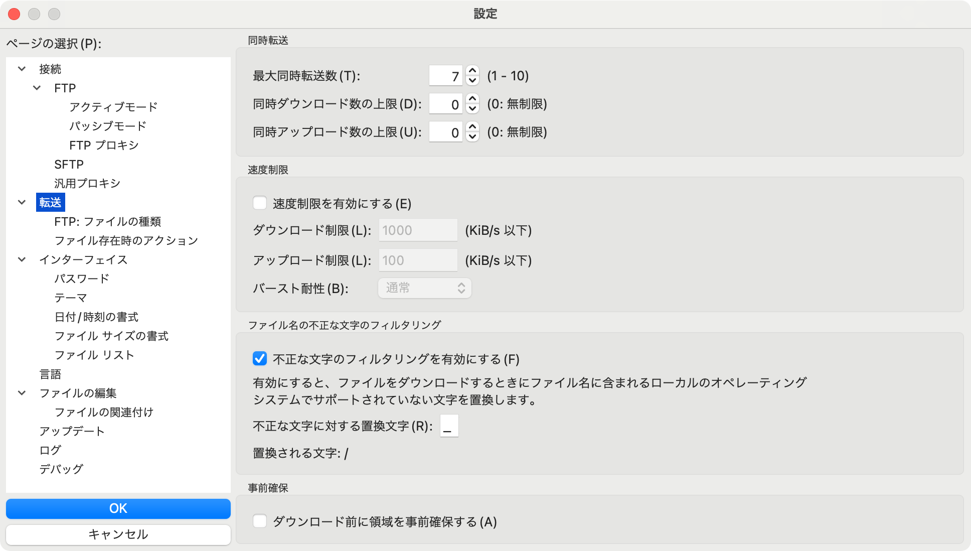 メニューの「設定」より転送設定(最大同時転送数)を行う。